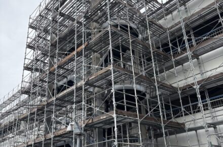 建物全周にわたり枠組み足場を設置し、各フロアの外壁・開口部まわりの作業スペースを確保しています。上層部には養生ネットを展張し、資材の落下防止と周辺への安全対策を徹底しながら施工を進めました。